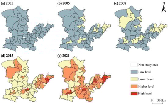 From 2001 to 2021, the new urbanization level in the MLYR showed an overall growth trend, from 0.1015 to 0.3979, an increase of 292.02%, with an average annual growth rate of 5.50% (Figure 4). The multi-year average showed that the proportion of lower-level cities was relatively large, accounting for 68.33%, followed by low-level cities, accounting for 25.00%. There were only four high and higher cities, namely Xi’an, Zhengzhou, Jinan, and Qingdao, indicating that the new urbanization level in the MLYR has great potential for development. The higher-level and lower-level cities showed clustering characteristics in space, while the high-level cities showed sporadic distribution characteristics, and the new urbanization level in most cities was constantly improving. This promotion showed a certain diffusion effect, starting from the growth of provincial capital cities and sub-central cities in each province, and spreading to the geographically adjacent cities. In 2021, low-level cities disappeared, mainly transformed into lower and higher-level cities. The number of lower-level cities increased by 20, higher-level cities increased by 35, and high-level cities increased by 5.