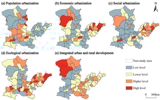 Population urbanization (a), economic urbanization (b), social urbanization (c), ecological urbanization (d), and integrated urban and rural development (e) level in the MLYR.