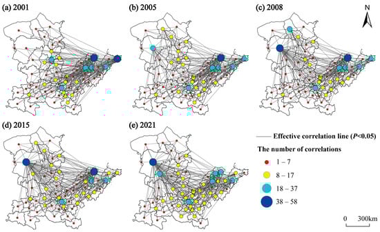 Spatial correlation network of new urbanization in the MLYR in 2001 (a), 2005 (b), 2008 (c), 2015 (d), and 2021 (e). Note: the effective connection line passed the significance test of 95% confidence interval.