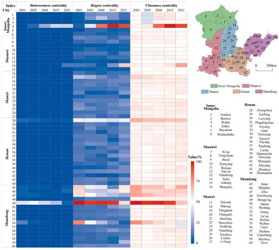 Three parameters of betweenness centrality, degree centrality, and closeness centrality were used to further describe the role of each city in the spatial correlation network (Figure 7). The average betweenness centrality showed an increasing trend, from 1.4456 in 2001 to 1.4807 in 2021, an increase of 2.43%, indicating that the moderating effect of each city on its surrounding cities was enhanced. The betweenness centrality was mostly high in the east, while mostly low in the west. The average degree centrality also showed an increasing trend, from 16.44 to 19.27, an increase of 17.21%, indicating that the links between cities were gradually increasing, and the status of most cities in the spatial correlation network was steadily increasing. On the contrary, the average closeness centrality gradually decreased from 55.15 to 54.42, a decrease of 1.32%. The role of Shandong Province was the most obvious, and the advantages of its new urbanization development were gradually decreasing compared with other cities. Overall, these changes of centrality may be attributed to two main reasons. First, the relative development speed of central cities, such as those in Shandong Province, had slowed down, leading to a gradual dilution of their influence and a consequent decline in their closeness centrality. Second, the continuous improvement in urbanization levels of cities like Ordos and Zhengzhou contributed to a more balanced network structure [39].