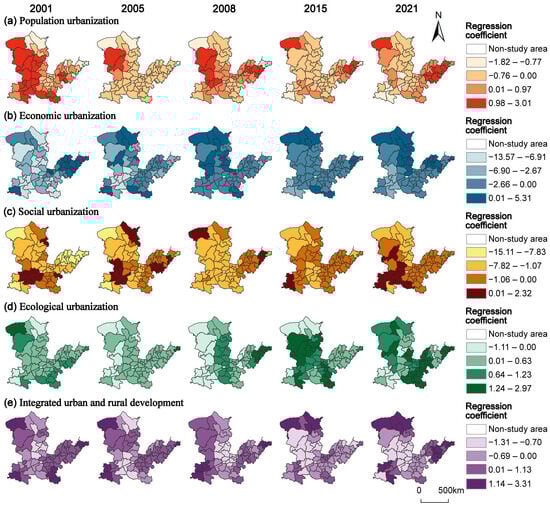 The GTWR model was further used to analyze the spatial and temporal differences of the impact. Before using this model, a significance test was conducted. The results showed that all variables except closeness centrality passed the significance test at the 95% confidence interval. Therefore, closeness centrality was excluded from the subsequent analysis. The results showed that population urbanization, ecological urbanization, and integrated urban–rural development were positively correlated with ULGUE, while economic urbanization and social urbanization were negatively correlated with ULGUE.