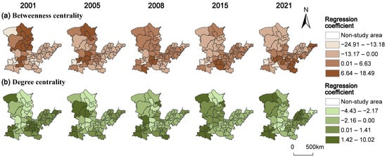 On the whole, betweenness centrality showed a positive correlation with ULGUE, while degree centrality mainly showed a negative correlation (Figure 9). The average regression coefficient of betweenness centrality to ULGUE was 1.7815, and its positive correlation expanded over time, with the most significant changes observed in Henan. This may be attributed to its strategic location as a transportation hub in the MLYR, which enhances its role in resource and information flow, thereby strengthening its positive impact on ULGUE. The average regression coefficient of degree centrality to ULGUE is −0.3844. The enhanced centrality of individual cities may hinder the balanced allocation of resources in the spatial correlation network, resulting in a negative correlation with ULGUE. Spatially, the promotion correlation of Inner Mongolia, southern Shaanxi, and Shandong was obvious, which was contrary to the overall situation. The resource-based economy of Inner Mongolia, the ecological economy of southern Shaanxi, and the advanced industrial base of Shandong may have created localized development patterns that diverge from the overall trend.