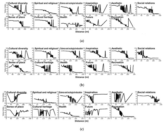 The spatial distribution of CESs reflects the values at specific locations, represented by 1–10 value gradients. The highest value in the figures indicates the maximum value index (MVI) for each CES (Table 4). This index evaluates the maximum CES value by considering the aggregation of value points, subjective evaluations of volunteers, and the number of value points. Males had a higher MVI for science and ecological education, inspiration, future, and recreation values, whereas females had a higher MVI for cultural heritage and health values. Both sexes showed a similar MVI for cultural diversity, spiritual and religious, aesthetic, social relations, and sense of place.