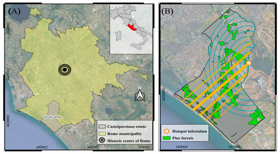 (A) Geographical location of the Castelporziano Presidential Estate in the Rome municipality area (In red the Lazio region, Italy). (B) Map of Castelporziano Estate with the scale pest infestation hotspot, the concentric circles representing a uniform dispersion model (cyan color), and the linear spread along the line of the prevailing wind passing through the infestation hotspot (yellow color). Coordinate Reference System: WGS84/UTM zone 33N.