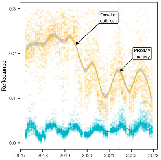 The monthly median and composite values of near-infrared (yellow color) and visible red (cyan color) reflectance were sampled at 40 random points in the forest stands and loess-smoothed curves. PRISMA is an acronym for “Hyperspectral Precursor of the Application Mission” earth observation system used to detect the symptoms of infestation of Toumeyella parvicornis in forest stands.