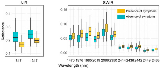 Boxplot of reflectance value distributions per class in each of the relevant bands for symptom detection.