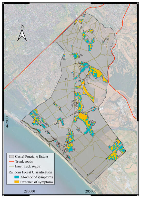 The RF classifier revealed an overall good accuracy (82%), specifically in correctly identifying the pine forest pixels affected by PTS (94% user accuracy in the “symptomatic” class, -UA- in Table 1). Despite that, a certain amount of variability affects the estimated predictions (80% producer accuracy in the “symptomatic” class, -PA- in Table 1). Thus, the classifier metric shows the potential for monitoring and correctly detecting PTS outbreaks in pine forests at the cost of misclassifying asymptomatic forest patches as being attacked by PTS once every five predictions of infestation presence.