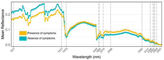 Average reflectance spectrum graph for the presence (yellow)/absence (cyan) of symptom classes, highlighting important bands selected by RF with vertical segments.