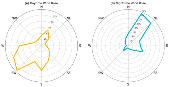Wind rose charts of daytime prevailing wind recorded from 08:00 to 21:00 (A) and nighttime prevailing wind recorded from 21:01 to 07:59; (B) The percentages represent the frequency of the wind observations coming from a specific direction, measured in degrees from the North.