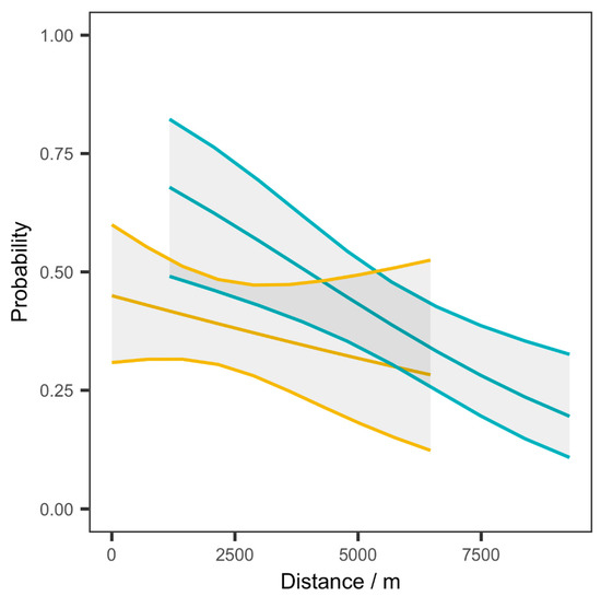 In UDM, the pine forest pixels that are closest to the infestation hotspot are shown to bear about a 60% probability of being symptomatic, whereas those furthest away have the greatest chances of escaping infestation (less than 25% infestation probability when 8 km away). In the PWDM, the probability of a pine forest pixel being labeled as symptomatic is not significantly affected by the distance from the dominant wind direction due to a wide confidence interval (Figure 7) and a very low t-value (three times lower than the UDM t-value).