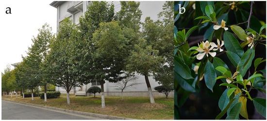 Photographs of Michelia chapensis (Photo courtesy of Xiyang Ye). (a) The plant of Michelia chapensis; (b) the flower of Michelia chapensis, with a flowering period from March to April.