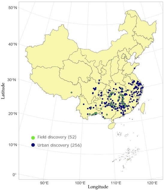 We compiled data on species distributions provided by Global Biodiversity Information Facility (GBIF, 2023) [57], the Chinese Virtual Herbarium (CVH, 2024) [58], the Flora of China—iPlant Species Information System (iPlant.cn, 2023), and field observations. Additionally, this study innovatively incorporated citizen science data from Sina Weibo (weibo.com, 2023) and rigorously filtered the records according to the workflow for constructing species distribution databases using social media data (see Figure S1). This pioneering approach enabled the construction of a comprehensive dataset documenting both wild and cultivated populations of Michelia chapensis across southern China. Subsequent analyses were based on distribution data with precise longitude and latitude coordinates. For records lacking accurate geographic coordinates, the Amap Open Platform was utilized to retrieve map API information [59], thereby transforming textual records into three-dimensional coordinate data. Following the removal of redundant or suspicious data, the database comprised 503 distribution records across mainland China. Due to variations in mapping methodologies and precision between vegetation surveys and citizen science data, the spatial coverage of the data is uneven [23,59]. In order to ensure data consistency and comparability, all observational data were standardized to the WGS1984 coordinate system. A 0.25° grid was applied, and random resampling was conducted (i.e., selecting only one observation point per grid from the distribution data) to mitigate the effects of uneven sampling intensity and maintain uniform data point density [60]. Following resampling, a total of 256 observations were retained for the construction of SDMs (see Figure 3). The study area was delineated by establishing a 500 km buffer zone [23].