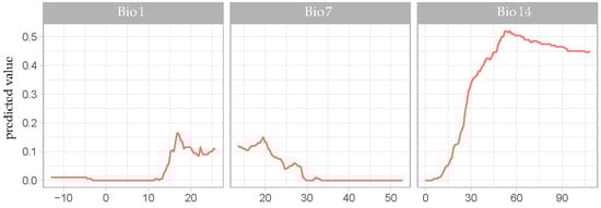 The results from single models indicated that Bio14 significantly impact the distribution of Michelia chapensis. Specifically, the ensemble model aligns with the results of most single models (Figure S1), demonstrating the stability of the ensemble model. Both single and ensemble model results indicate that Bio14, Bio1, and Bio7 significantly impact model performance.
