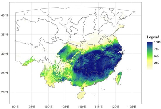 The future climate data were based on the Shared Socioeconomic Pathways (SSPs) provided by the Intergovernmental Panel on Climate Change (IPCC) Sixth Assessment Report (AR6) [65], which updated the Representative Concentration Pathways (RCPs) taken from the IPCC Fifth Assessment Report (IPCC AR5) [66]. Data from the Beijing Climate Center Climate System Model (BCC-CSM2-MR) [67], a Global Circulation Model (GCM) better suited to China’s climatic conditions, were used as future climate data to predict the potential suitable areas of Michelia chapensis. The model demonstrates the best performance in reproducing anomalous precipitation patterns in eastern China, with the highest spatial correlation coefficient [68]. Predictions were made for two future climate scenarios, an optimistic scenario (SSP126) and a pessimistic scenario (SSP585), focusing on four timeframes: 2021–2040 (the 2030s); 2041–2060 (the 2050s); 2061–2080 (the 2070s); and 2081–2100 (the 2090s). The SSP126 scenario reflects sustainable development, representing the most optimistic scenario corresponding to RCP2.6 in the Fifth Assessment Report, while the SSP585 scenario is based on a “business-as-usual” fossil fuel development pathway, corresponding to RCP8.5. For each SSP and timeframe, a resolution of 2.5 min was selected for prediction, consistent with the species distribution data.