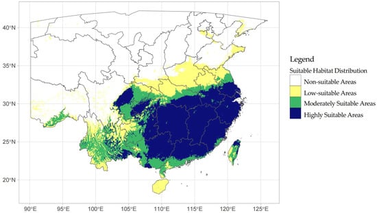 Potential geographic distribution of Michelia chapensis habitats under current climate conditions. Based on the distribution maps obtained from the modeling, the suitability index was calculated and classified into four categories using the equal interval method, which divides the range of habitat suitability values into equal intervals. The four categories are non-suitable areas, representing regions that lack suitable habitat conditions; low-suitability areas, characterized by minimal habitat suitability; moderately suitable areas, indicating regions with moderate habitat suitability; and highly suitable areas, denoting regions with high habitat suitability.