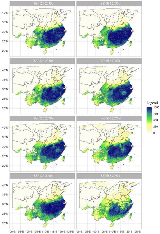 Conversely, under SSP585, the suitable areas of Michelia chapensis are projected to expand first and then shrink. Compared to the current condition, the suitable habitat area will increase by 14.80% and 14.47% in the 2030s and 2050s, respectively, and will extend into Central China and even Northern China. Nevertheless, the expansion area exhibits low suitability. In the 2070s, although suitable areas will decrease compared with the 2030s and 2050s, the distribution area will still increase by 5.50% compared to the current climate condition. However, in the 2090s, the suitable areas of Michelia chapensis are projected to decrease by 19.03% compared to the current climate condition.