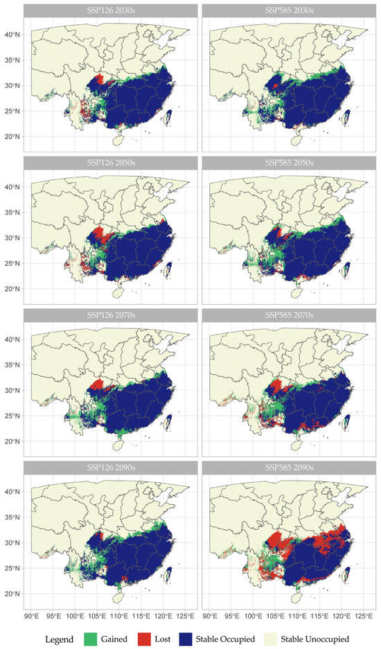 Compared to the current climate, the suitable distribution area of Michelia chapensis expanded more than it declined overall, indicating an expansion trend (see Figure 8). The change in suitable distribution areas of Michelia chapensis varies depending on the time and climate scenario considered. The suitable habitat will expand the most in 2090s (15.83%) and the least in the 2050s (1.99%) under SSP126. Furthermore, the expansion area will be located in the Huai River Basin, the southern side of the Qinling Mountains, and parts of Yunnan and Guizhou. Conversely, a contraction of suitable habitat is projected under SSP585 in the 2090s, with a decrease from 15.9 × 105 km2 to 12.9 × 105 km2. Overall, in the four periods under the SSP585 scenario, the suitable distribution areas in the Sichuan–Chongqing region, parts of the middle and lower reaches of the Yangtze River, the area around Poyang Lake, and parts of southern Guangdong show an increasing trend of decline over time, with the most significant reductions in the 2070s and 2090s.