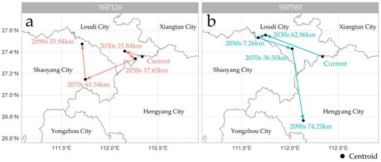 Changes in the centroid of the potential of Michelia chapensis under different climate scenarios. Arrows indicate the possible direction and magnitude of centroid shifts over time. (a) The trajectory of centroid shift under the SSP126 scenario; (b) The trajectory of centroid shift under the SSP585 scenario.