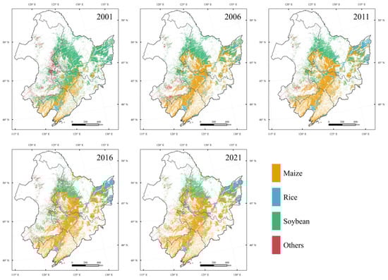 Crop distribution maps (Figure 2) reveal that maize cultivation expanded continuously from 2001 to 2021, becoming the dominant crop in Northeast China. Its planting areas were concentrated in the Liaohe and Songnen Plains, with a notable northward shift in cultivation boundaries. Rice cultivation also doubled in area during this period, primarily along riverine zones. Conversely, soybean cultivation contracted significantly, relocating to northern regions, particularly within Heilongjiang Province.