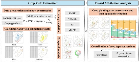 This study employed MODIS NPP data and a dry matter-to-yield conversion framework to conduct remote sensing estimation of crop yields and analyze the impact of crop type transitions on yield variations. The research consisted of two interconnected components: the first focuses on yield estimation for maize, rice, and soybean, while the second quantifies the contribution of crop planting pattern shifts to regional yield changes (Figure 3). The implementation process began with acquiring MODIS NPP datasets spanning 2001 to 2021 from the MODIS Earth Observation System, specifically targeting Northeast China’s agricultural growing seasons. Subsequent spatiotemporal matching of maize, rice, and soybean cultivation patterns was conducted according to their phenological characteristics, complemented by crop-specific parameters obtained through field surveys and synthesis of existing literature. These inputs enabled yield calculations using the dry matter conversion framework. To ensure robustness, long-term yield trends were systematically analyzed through the Theil–Sen median method and Mann–Kendall statistical test, with validation against authoritative agricultural yearbook records. Finally, a phased attribution analysis integrating historical crop planting structure data was implemented to disentangle and quantify the proportional impacts of crop type transitions on total yield dynamics. This integrated methodology enhances the mechanistic understanding of land use decisions in agricultural productivity, offering actionable insights for sustainable cropland management strategies.