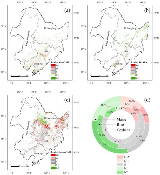 Yield change types of maize (a), rice (b), soybean (c) and the proportions of five change types (d). D-2 indicates significant decrease, D-1 indicates slight decrease, S indicates stable, I-1 indicates slight increase, and I-2 indicates significant increase.