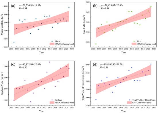 Temporal trends and trend analysis of maize (a), rice (b), soybean (c), and total yield of three crops (d) in Northeast China from 2001 to 2021.