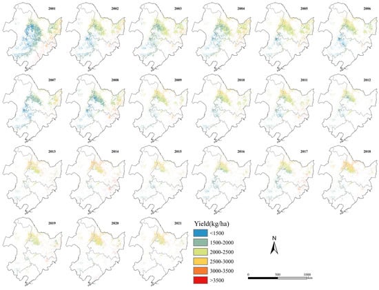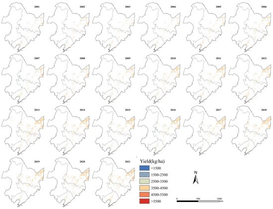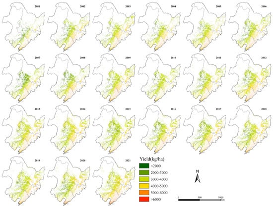 Spatial distribution of the annual average yield of rice from 2001 to 2021.