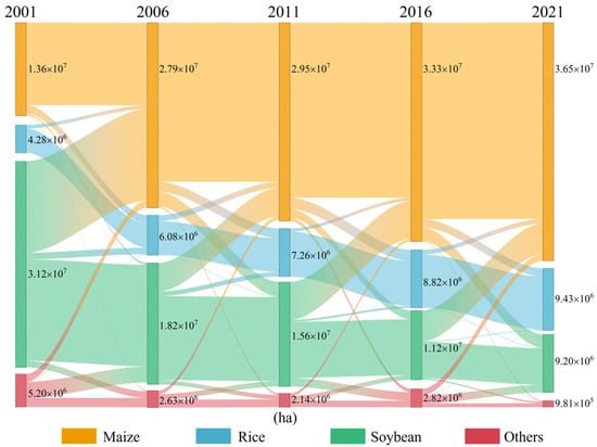 From 2006–2011, soybean areas continued to decline but at a reduced rate, with 2.40 Mha converted to maize. Concurrently, maize areas grew modestly (+1.60 Mha), and rice cultivation expanded by 1.16 Mha, primarily through newly developed paddies in the northeastern Sanjiang Plain.