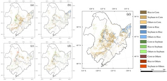 Spatial distribution of conversions between different crop types across temporal phases: (a) depicts the period 2001–2006, (b) corresponds to 2006–2011, (c) illustrates 2011–2016, (d) covers 2016–2021, and (e) synthesizes the entire period 2001–2021.