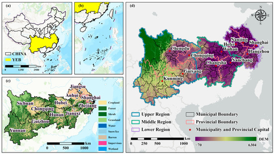 Study area. (a) The location of the YEB in China; (b) the south sea of China; (c) land use types based on CLCD in the YEB in 2022; (d) administrative division and digital elevation model map of the YEB.