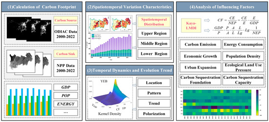 This paper constructs a multi-level research framework from the perspective of carbon sources and carbon sinks, as illustrated in Figure 3. (1) The city-scale carbon footprint is calculated using ODIAC carbon source data and NPP data from 2000 to 2022. (2) The temporal and spatial characteristics of the carbon footprint are analyzed based on the changing trends in the upper, middle, and lower reaches of the Yangtze River Economic Belt. (3) A three-dimensional kernel density estimation method is employed to examine the dynamic and evolving characteristics of the carbon footprint distribution across the entire Yangtze River Economic Belt, as well as its upper, middle, and lower regions, focusing on distribution location, distribution form, distribution trends, and polarization phenomena. (4) Finally, the Kaya-LMDI model is used to decompose and analyze the main driving factors affecting the carbon footprint.