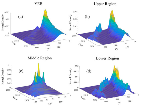 The kernel density estimation of the carbon footprint in the Yangtze River Economic Belt is shown in Figure 5. The following paragraphs will reveal and describe in detail the dynamic distribution and evolutionary characteristics of the carbon footprint in the overall YEB and its upper, middle, and lower regions from 2000 to 2022, focusing on four aspects: distribution location, distribution pattern, distribution trend, and polarization phenomena [48,49].
