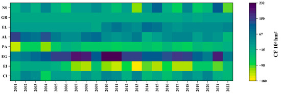 The carbon footprint of the YEB is decomposed into the factors of carbon emission intensity (CI), energy consumption intensity (EI), economic growth (EG), population density (PA), urban expansion (AL), ecological land use pressure (EL), carbon sequestration foundation (GR), and carbon sequestration capacity (NS). Using 2000 as the base year, the annual and cumulative effects of each driving factor on the carbon footprint of the YEB are calculated (Table 2).