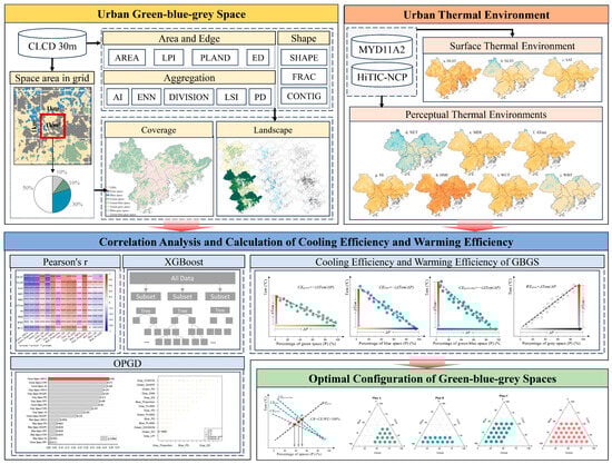 We used Pearson’s correlation coefficient, OPGD (Optimal Proportional Gradient Difference), and XGBoost (Extreme Gradient Boosting) to explore the relationship between USCL and UTE. We then calculated the CE of blue and green spaces and the WE of grey spaces to summarize the optimal spatial coverage and explored spatial patterns under different combination scenarios (Figure 2).
