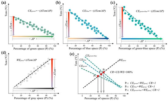 Schematic diagram illustrating the quantification of CE, WE, and CR. (a) The CE of green space. (b) The CE of blue space. (c) The CE of green–blue space. (d) The WE of grey space. (e) The CR of these spaces.