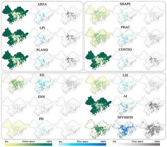 Landscape of GBGS in the GBA. The green spaces in Eastern, Western, and Northern Guangdong are highly concentrated, with large areas and strong connectivity. Blue spaces are sparse, with complex shapes, while grey spaces are small in area and low in density. In the Pearl River Delta, green spaces are small, fragmented, and complex in shape. Blue spaces have larger areas with high connectivity and aggregation, while grey spaces are also large in area with strong connectivity and aggregation.