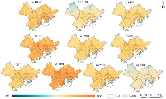 Urban thermal environment indicators include surface temperature, near-surface air temperature, and various human heat indices (Table 2). Surface and near-surface air temperatures represent surface urban thermal environments (STE), while human thermal indices reflect Perceptual Urban Thermal Environments (PTEs). Daytime land surface temperature (DLST) and nighttime land surface temperature (NLST) are widely used in urban heat environment studies due to their ability to effectively reflect the extent and intensity of UHI [,,]. Zhang generated a 1 km human thermal index dataset (HiTIC-Monthly) for China from 2003 to 2020 based on machine learning and various factors []. This dataset characterizes human-perceived temperatures, including outdoor shaded temperature (ATout), net effective temperature (NET), heat stress index (HMI), heat index (HI), wind chill temperature (WCT), and wet-bulb temperature (WBT), among others. We extracted all thermal indices for the GBA region and calculated the annual mean for each index within the grid.
