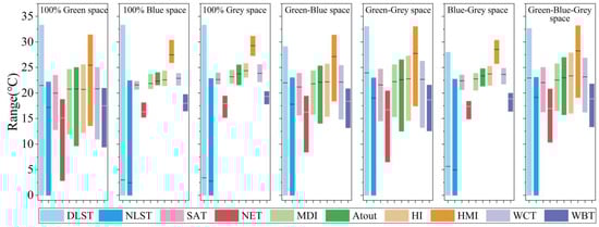 Thermal differences also exist across different zones (Figure 6). Grids containing green space (such as green and green–blue) show a wider range between STE and PTE, with average temperatures lower than the overall regional average (Table 4). In contrast, grids with grey space (such as grey, green–grey, and blue–grey) have higher average temperatures than the regional average.
