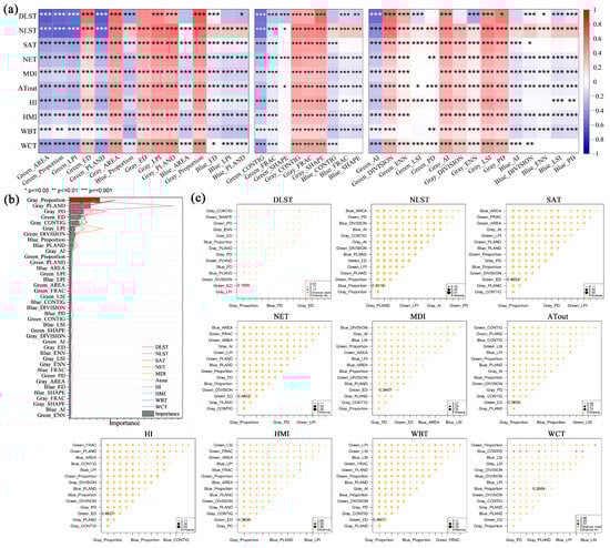The impact of urban space coverage and landscape on the urban thermal environment. (a) the results of the Pearson correlation analysis. (b) The results of the XGBoost analysis. (c) The results of the OPGD analysis.