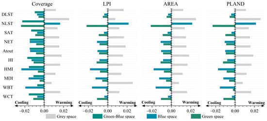 Urban green spaces, blue spaces, and blue–green spaces have varying cooling efficiencies on the UTE, whereas grey spaces exhibit a significant warming effect (Figure 8). Coverage represents the cooling or warming effect resulting from a 1% increase in each space type within each grid. Blue spaces absorb significant solar radiation during the day and release it slowly at night, causing a warming effect on NLST with a WE of 0.1634 °C/%. However, blue spaces exert a cooling effect on other temperature indices, with an average CE of 0.0136 °C/%, while green spaces have a lower average CE of 0.0088 °C/% on the UTE. The CE difference between blue and green spaces is small for PTE, but blue spaces are more effective in cooling than green spaces for STE. Additionally, the average CE of blue–green spaces on the UTE is 0.1422 °C/%, indicating that the cooling effect of the combined blue and green space distribution is greater than that of either space type alone. In contrast, the average WE of grey spaces on the UTE is 0.1519 °C/%, higher than the CE of blue spaces, green spaces, and blue–green spaces. This means that a 1% increase in grey space requires more blue–green spaces to counterbalance the warming effect. LPI, AREA, and PLAND characterize the cooling and warming efficiencies of each 1% increase in maximum patch share, patch area, and patch percentage for different space types. Consistent with the coverage calculations, LPI, AREA, and PLAND of blue and green spaces contribute to cooling the urban thermal environment, whereas grey spaces intensify warming. However, the WE and CE do not fully offset each other.