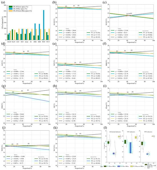 Cooling-to-Warming ratio and the intersection analysis of the CEgreen, CEblue, CEgreen–blue and WEgrey. (a) The CR of green and blue spaces in STE and PET cooling. (b–k) The intersection points of CEs and WE for DLST, NLST, SAT, NET, HI, HMI, ATout, MDI, WBT, and WCT. (l) Coverage analysis based on intersections.