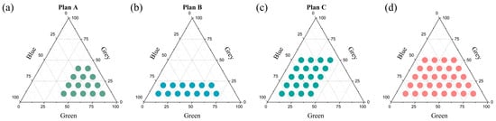 Combination scenarios of green, blue, and grey spaces. (a) Green spaces as the dominant feature. (b) Blue spaces as the dominant feature. (c) Green–blue spaces are the dominant feature. (d) All scenarios across different plans.