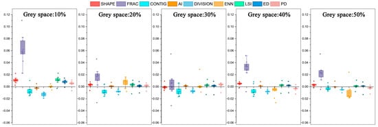 Warming efficiency of shape and aggregation indices in different grey space coverage. The vertical axis represents WE, where a value greater than 0 indicates a warming effect, and a value less than 0 indicates a cooling effect.