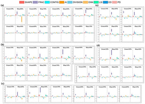 The CE of blue and green spaces varies with different landscape configurations under the same coverage of grey spaces (Figure 12). In a grid with 10% grey spaces, there are eight blue–green space scenarios (Figure 12a). When green space coverage is less than 40%, shape indices (SHAPE, FRAC) show higher CE. However, when green space exceeds 40%, the CE of shape indices becomes negative. This suggests that more complex green space shapes contribute to warming. Aggregation indices, in contrast, consistently show a slight cooling or warming effect. When blue space coverage is between 50% and 60%, FRAC shows relatively high CE, while DIVISION and ENN have a warming effect. Therefore, large, aggregated, and complex water is beneficial for cooling. In a grid with 20% grey spaces, there are seven blue–green space scenarios (Figure 12b). For green space, the coverage range of 30% to 40% marks the inflection points where shape and aggregation indices shift from cooling to warming. For blue space, FRAC shows the highest CE, but as coverage decreases, cooling efficiency diminishes. In a grid with 30% grey spaces, there are six blue–green space scenarios (Figure 12c). In these scenarios, the contribution of green space shape and aggregation to cooling is minimal. In contrast, blue spaces with more complex boundaries and higher fragmentation show more significant cooling benefits. In a grid with 40% grey spaces, there are five blue–green space scenarios (Figure 12d). When green space coverage is greater than 10% but less than 40%, the CE of shape indices is high, particularly FRAC and ENN. However, it shifts to a warming effect once coverage reaches 40%. For blue space, when coverage is between 40% and 50%, CE is relatively high across all indices, but ENN and DIVISION show warming effects. As blue space coverage decreases, the influence of shape and aggregation indices on temperature gradually weakens. In a grid with 50% grey spaces, there are four blue–green space scenarios (Figure 12c). When green space coverage is 20%, both shape and aggregation indices show relatively high CE. In addition to warming NLST, 30% blue space demonstrates a significant cooling effect on the overall urban thermal environment.