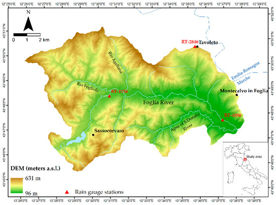 Three rain gauge stations are currently active in the study area (Figure 1), managed by the Civil Protection of the Marche Region: Ca’ Mazzasette station (RT-1056), Bronzo station (RT-1156), Tavoleto station (RT-2846).