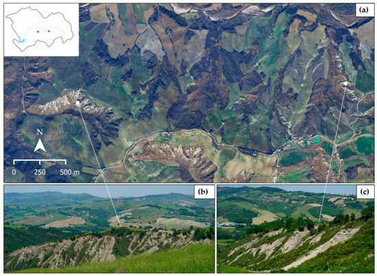 Examples of badlands of the study area: (a) Google Satellite view of the badland types (2024). (b) Badlands of type A and (c) Badlands of type B near Sassocorvaro, Marche region (photo taken by Margherita Bianchini, 2023).