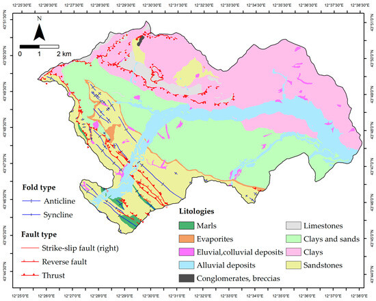 In the valley floor and intravalline plains, Quaternary deposits of alluvial and eluvio-colluvial origin are identified, including Holocene sediments ranging from gravelly to clayey, and Pleistocene deposits represented by gravel with a sandy matrix. In the northern sector and the southwestern strip, the area is affected by a dense system of thrusts that play an important role in the overlap and folding of the outcropping units, as can be seen in the rocks of the Marnoso–Arenacea Formation exposed in the western sector.