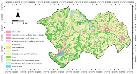 The land use map was simplified into six classes: water bodies, agricultural areas, urban areas, wooded areas, shrub and/or herbaceous vegetation, and bare soils or abandoned lands [16] (Table 4).
