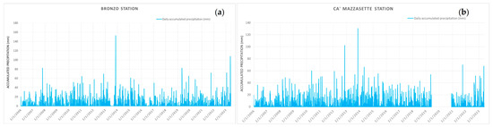 Graphic representation of the daily precipitation (mm) in the period 2006–2023 at (a) Bronzo station (PU) and (b) Ca’ Mazzasette station (PU).
