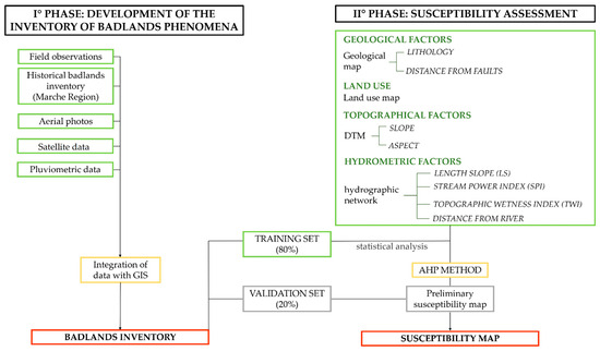 The methodology is divided into two phases (Figure 7). The first phase focuses on the development of an inventory of the badlands. The second phase is dedicated to the badlands’ susceptibility assessment.